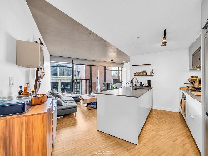 Live in the ICONIC WOODWARD'S Building! Here it is - your chance to own in one of Vancouver's most recognizable landmark buildings. This stylish and modern 1-bedroom + oversized den (with closet!) offers an open, light-filled layout overlooking a peaceful courtyard. The contemporary kitchen features stone countertops, gas range, and in-suite laundry, while exposed concrete ceilings and gallery-style walls give the space a cool, urban edge. Your strata fees include internet, heat, hot water, and gas, making this home as practical as it is beautiful. Enjoy incredible city and mountain views from the rooftop indoor/outdoor lounge and deck - complete with a state-of-the-art gym, outdoor hot tub, and 24/7 concierge. Just a 7-minute walk to Waterfront Station. Open house Saturday Jan 10th 2-4!