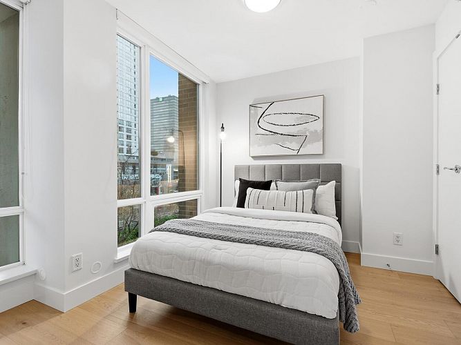 Welcome to our immaculate 1 bedroom at Dolce. The concierge staffed lobby welcome you Home before whisking you to the 7th floor where wood flooring meets you at your suite. Passing by the den/flex space leads you to an open kitchen w/ under cabinet lighting bouncing off the quartz countertops & marble backsplash. Contemporary frosted glass sliding doors partition the bedroom w/ floor ceiling windows next to an ample living room w/ sliding doors out to the covered balcony. The gleaming bright bathroom w/ a deep soaker tub & tile surround also houses the in suite laundry. Exceptional amenities on the 5th floor including fitness facility, playground, lounge, terrace, steam room & hot tub looking out over city views. 2 cats/dogs or 1 each allowed.