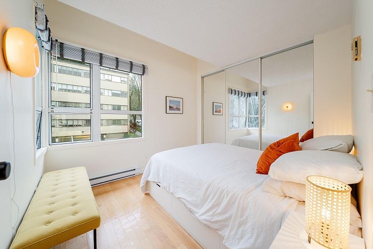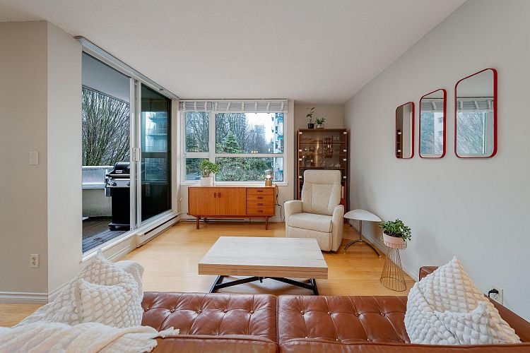 Suite 401 at Julia Court is a West End gem filled w/ character, light & calm. This bright corner home features HW floors throughout & is wrapped in windows overlooking a tranquil tree canopy. Whisper-quiet w/ a thoughtful & functional layout offering separate living & dining rms. The updated open kitchen incl S/S appliances, induction stove & a lrg kitchen counter—perfect for cooking & gathering. The spa-like bath fts heated flrs & a deep soaker tub. Julia Court is a boutique, architecturally renowned concrete bldg known for its welcoming community & open-air corridors. Lovingly maintained w/ major updates incl new roof, elevator, rainscreening, piping, windows & parking membrane. Pet-friendly w/ sauna, plus 1 prkng & storage incl. Steps from Sunset Beach, the seawall & Davie & Denman Str.