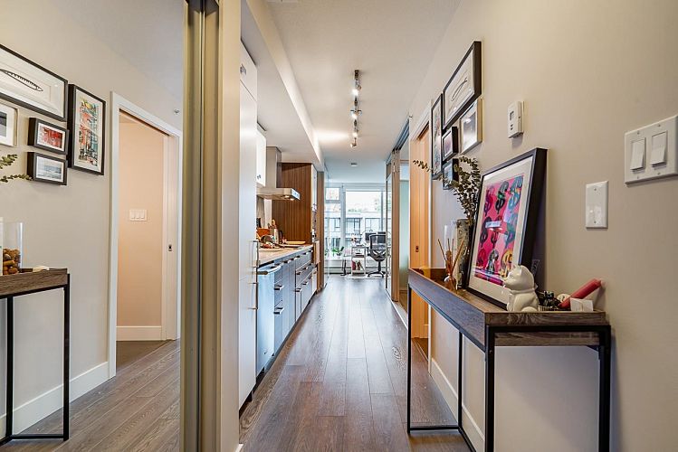 Welcome to Residences at West! This home is conveniently located in the heart of Olympic Village. Open concept and efficient floor plan offering 468sqft with a junior 1 bedroom and den/flex on quiet side of building. Notable features include floor to ceiling windows, stone counter tops, stainless steel and integrated appliances, insuite laundry, 1 parking stall & 1 bike locker. Building amenities include a fully equipped gym, party room with kitchen, outdoor garden and a daycare. Rental & pet friendly. Unbeatable location steps to the Sea Wall, Urban Fare, London Drugs, Starbucks, plus many amazing restaurants right at your doorstep. Only a short stroll to skytrain and countless other amenities. Showings by appointment.