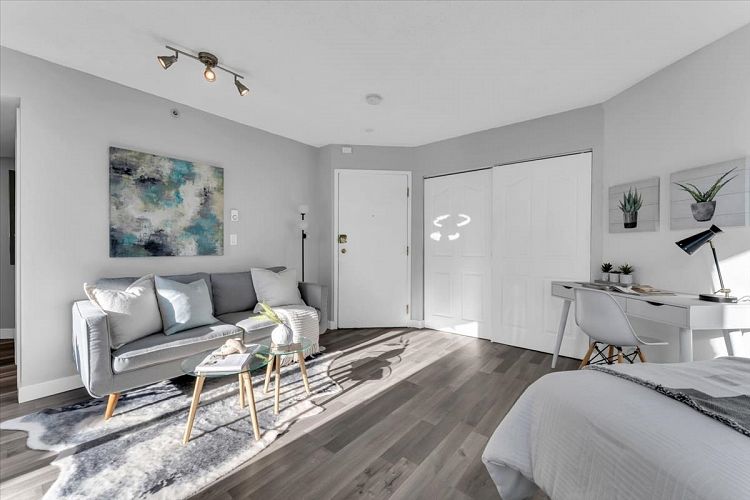 Fantastic studio home with huge private terrace, perfectly suited to any buyer who wishes to live, work, entertain and garden at home. Corner unit has above average privacy with NO neighbours next to the primary indoor living area. Windows on 2 sides for a nice cross breeze. This is indoor - outdoor living at its finest and its exclusively yours to furnish and enjoy a private garden full of your own fresh organics! Measuring up to 403 sq ft. Strata Plan shows 383 sq ft. Century Tower has a successful track record and has accomplished many building upgrades, rain screened, roof, elevators modernized. Come and check this home and the fantastic terrace!