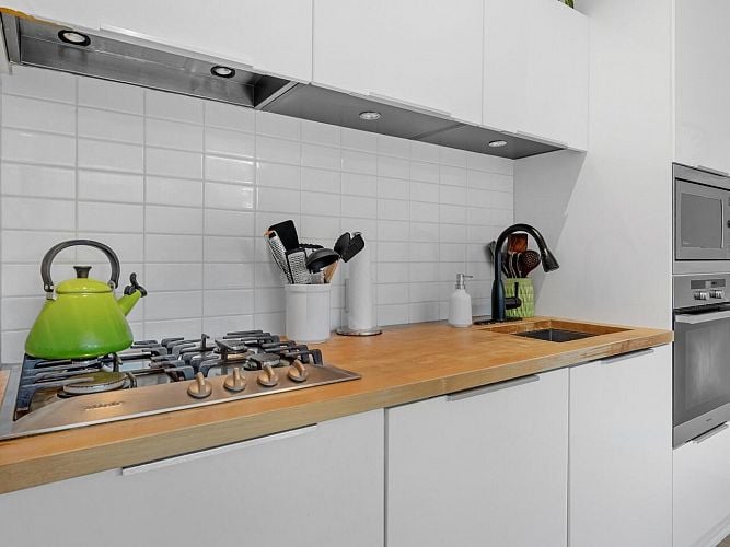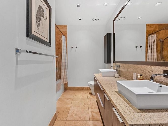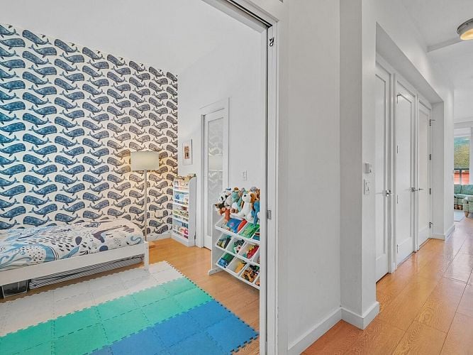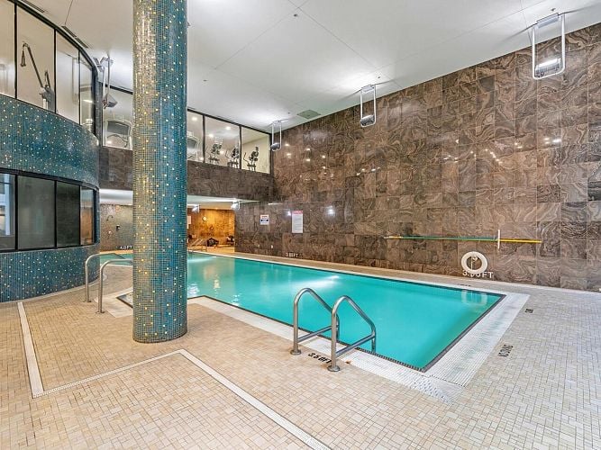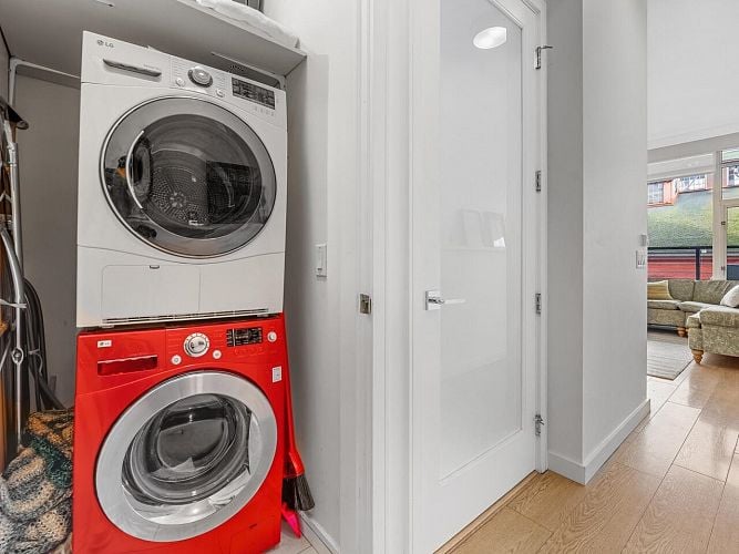 Compass in Olympic Village. The Condo - Great layout with bedroom and walk-in closet with custom organizers. The kitchen has been updated with high gloss cabinetry and butcher block countertop, Meile appliances, gas cooktop, and wall oven. Contemporary laminate flooring, nearly 10 foot ceilings, and a private outlook toward Craft Brewing (The historic Vancouver Salt Co). Peak at the water from the spacious patio. The Location - steps to the seawall, shops, theatres, coffee, and some of Vancouver's best seaside dining. The Building - leed certified, with open breezeways, radiant heating and cooling, and access to the world class amenities at The Gold Club for swimming, whirlpool, sauna, and a fully equipped fitness centre. Pets OK, secure parking (including for visitors) and storage locker.