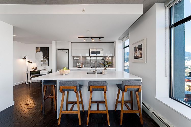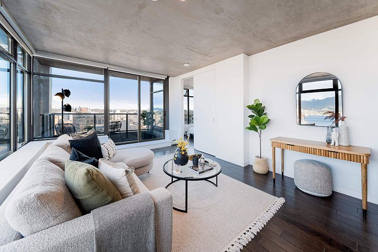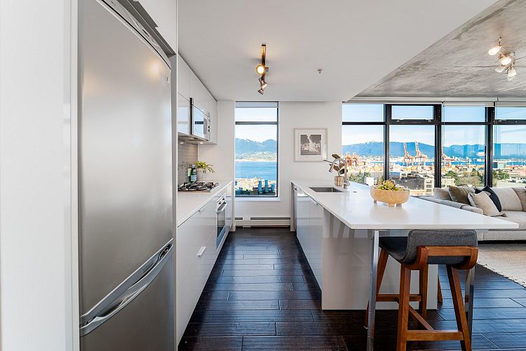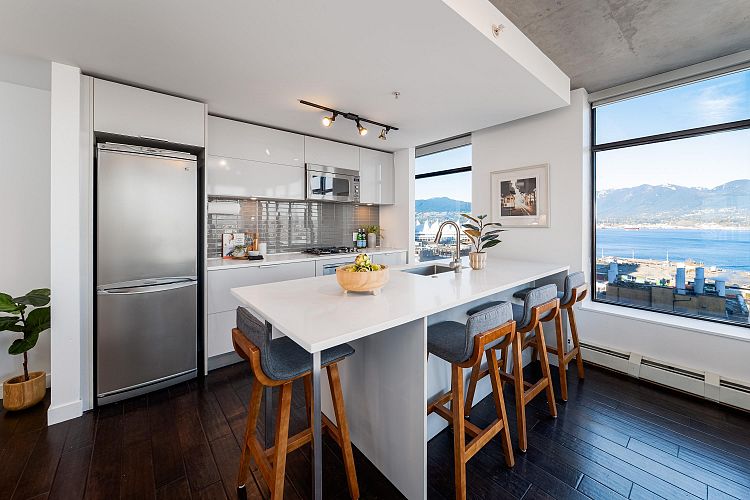 Stunning & unobstructed Mountain & City VIEWS from this coveted 01 corner unit that INCLUDES 1 SECURE PARKING! The floor to ceiling windows and large balcony allow for natural light & views of the North Shore mountains + Mt Baker, False Creek & everything in between. This is a highly desirable floor plan with ample living room space, a large bedroom with spa-like bathroom, spacious kitchen with large island + bar seats & gas cooktop and flex area for an office or more storage. You'll find updates throughout including floors & counters. Strata fee INCLUDES fast internet, heat, hot water, gas + amenities!! The building offers 24hr concierge + the incredible Club W amenities which includes the rooftop gym, indoor/outdoor lounge, hot tub & media room. Reach out to view!