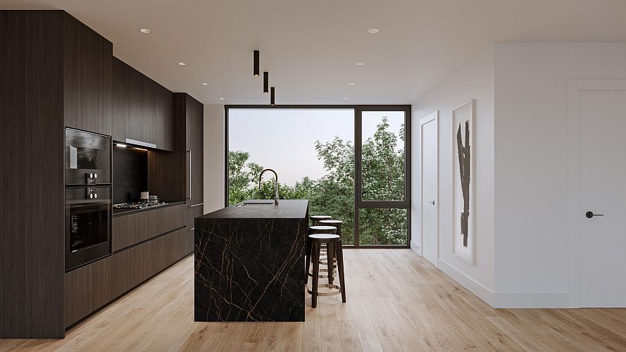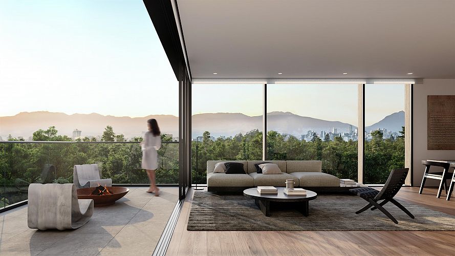 ASH | 28-Perched on one of the neighbourhood's highest points, this 3-bedroom, 2.5-bath home blends the spacious feel of a single-family home with refined West Coast design. The Penthouse Collection reimagines two-level living with a seamless connection between indoor and outdoor spaces. Floor-to-ceiling glass opens the living area onto a generous patio that flows directly to a private rooftop terrace-no detours through private spaces required. Panoramic views stretch across downtown Vancouver, the North Shore mountains, and lush greenery, creating a breathtaking backdrop. Thoughtful details include 9-ft ceilings, A/C, Italian cabinetry, and Gaggenau appliances. Designed by Shape Architecture and Ste Marie, this is a sophisticated expression of Vancouver living, completing Fall 2026.