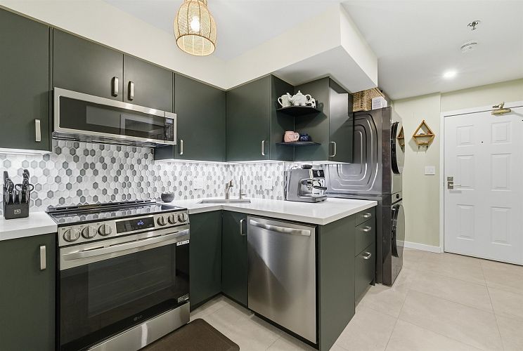 Completely renovated and truly move-in ready, this 1-bed, 1-bath ground-floor home offers bright south/east exposure and quality updates throughout. Enjoy radiant heated tile floors, a brand-new kitchen with green cabinets, stone counters, and new appliances. Spacious bedroom with walk-through closet w beautiful ensuite featuring a frameless glass shower, floating vanity, and backlit vanity /mirror.Comfortable living room with gas fireplace, custom storage + in-suite laundry. fully rain-screened with new windows, doors, balconies, roof and fencing (2014) and meticulously maintained with an excellent pro-active strata. Low Strata fees.pets are welcome (1 dog or cat). THE LOCATION: Nestled between Cambie + Oak St - it's the perfect location with a walk score of 87 and bike score of 97.