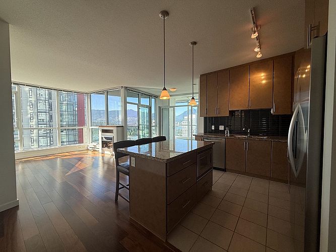 Stunning Views of Stanley Park, Marina & North Shore Mountains from this immaculate 2 bed/2 bath + flex corner suite. Move-in ready with fresh paint, modern lighting, and rich cherry HW flooring throughout. Ideal open floor plan w/ living and dining areas are framed by floor-to-ceiling windows, filling the home with natural light. The spacious kitchen features st/st appliances, gas cooktop, granite counters and island providing ample counter space. The primary bedroom includes lg W/I closet and ensuite bath. Bedrooms separated to maximize privacy Two versatile flex spaces include a storage room/pantry and a bright solarium, perfect as a home office w/water views. Amenities - 24 hr concierge, rooftop pool and hot tub, suana & fitness centre. Parking & Locker.