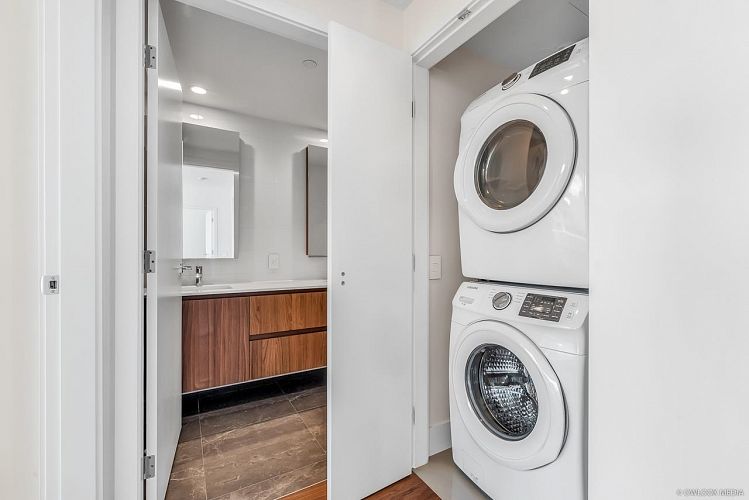 Belpark by Intracorp - Luxury CONCRETE development located in Westside Vancouver, steps to Langara Golf Course. Nearly 1100 SF 2 Bed, 2 Bath + Den is a END UNIT, featuring a (222sf) West-Facing PATIO & offering a walk-up TOWNHOUSE feel with its own private entrance or thru the building. Excellent layout, no wasted space. Bedrooms are situated on opposite ends for privacy. Italian-inspired kitchen features imported Italian cabinets, Gaggenau Appl, steam oven, wall oven, full-height wine cooler & 5-burner GAS cooktop. Spa bath complete w/marble accent walls, HEATED Marble Floors, wall-hung toilet, Dornbracht fixtures, deep soaker tub & rainshower fixtures. Equipped with A/C climate control for that perfect year-round temperature & HW flooring thru-out. Includes HUGE EV Parking & Locker