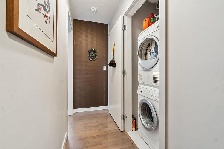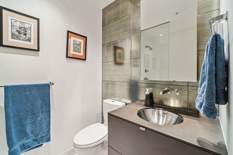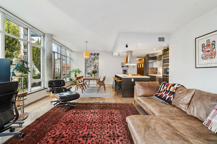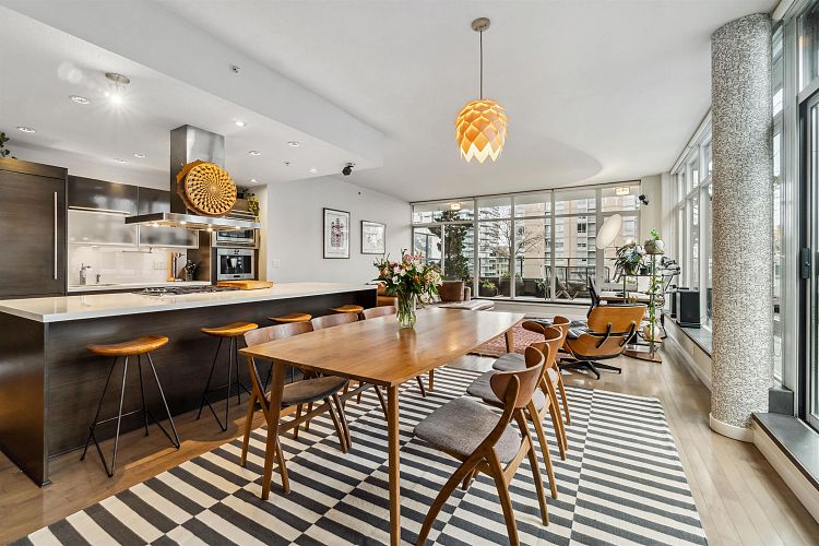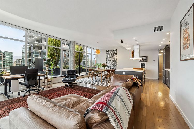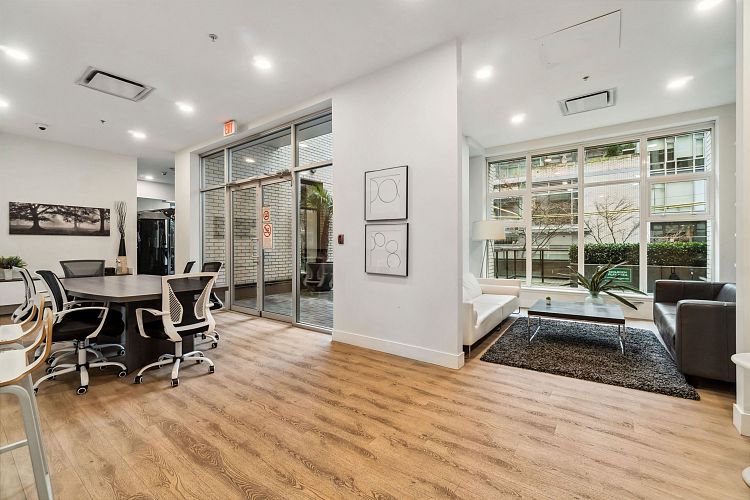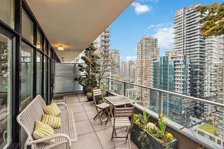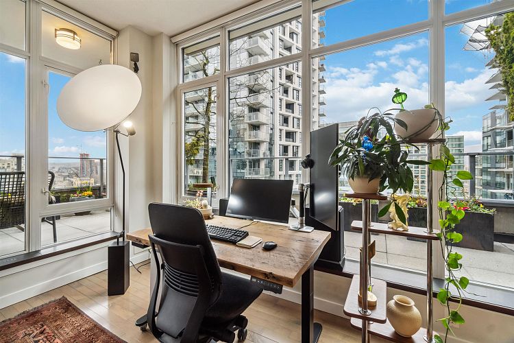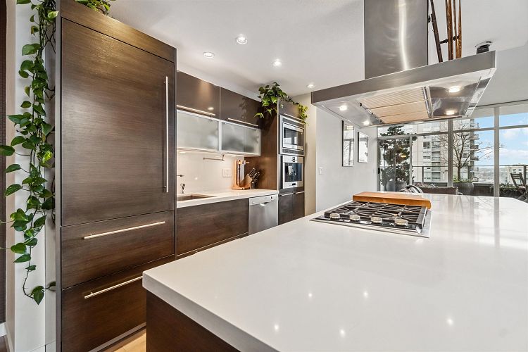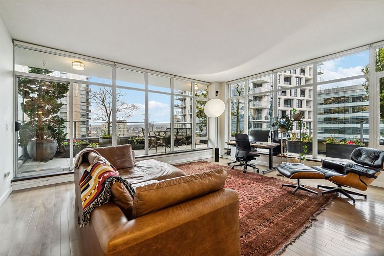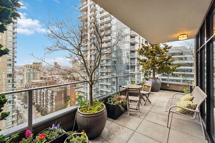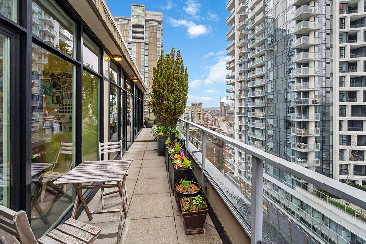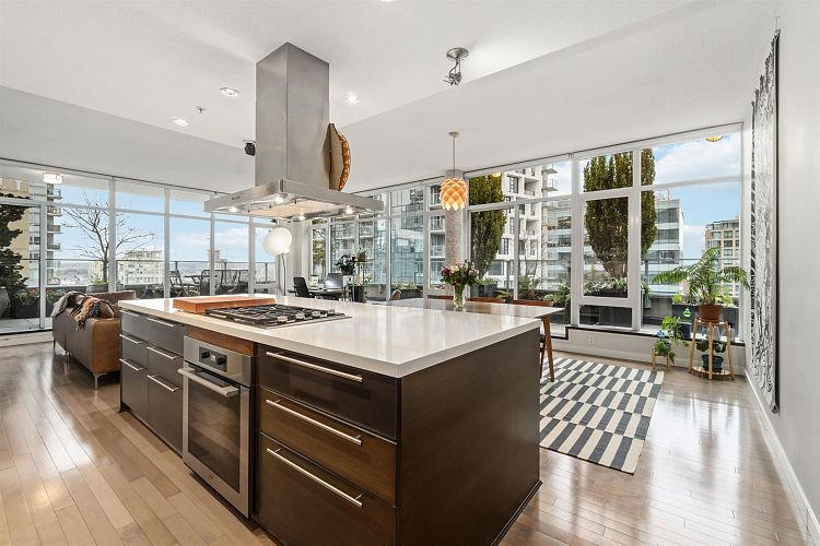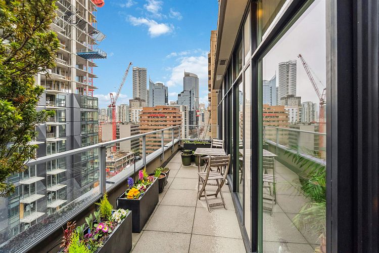 Discover elevated living in this luxurious penthouse condo, a stunning blend of modern architecture & high-end finishes. Nestled in the heart of Downtown Vancouver, the residence showcases a spacious 1287 sf interior & a breathtaking 508 SF wrap- around terrace that offers panoramic city views. Prepare to entertain in the sunlit great room and seamless access to the outdoor terrace, complete with lush garden plantings & a gas BBQ. The heart of this condo is its Euro kitchen, complete with a vast island, Wolfe gas cooktop, Subzero fridge and an espresso maker-all designed to inspire culinary creativity. Entertain in grand style or enjoy intimate meals, all while enjoying the backdrop of the city skyline. Rich hardwood floors flow throughout, complementing the airy primary and 2nd bedrooms.