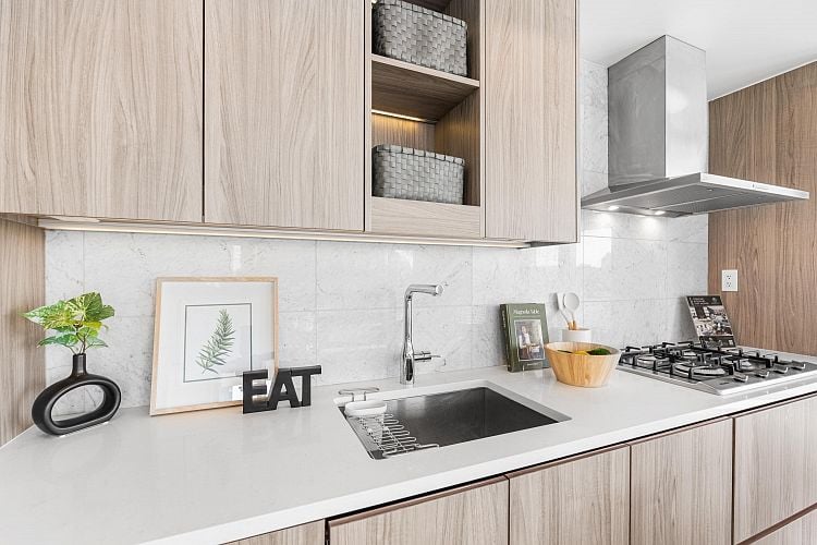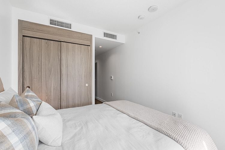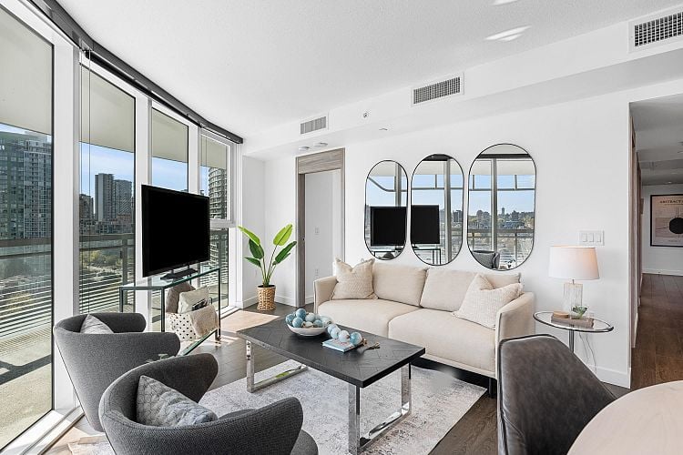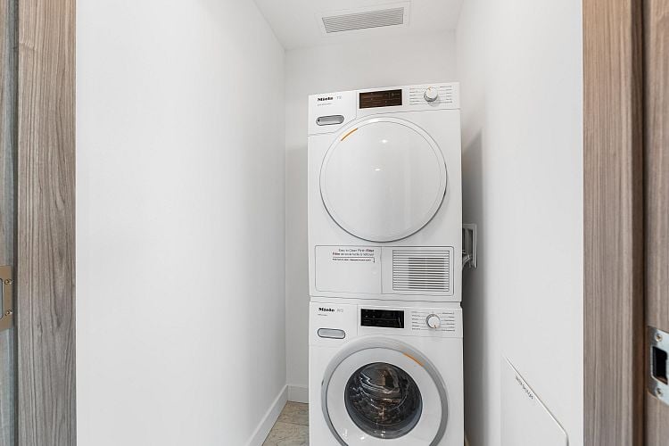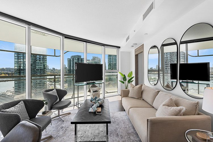 Beautifully designed 2-bed + Flex/Den, 2-bath Corner View Unit at 'The Arc'. Perched on the front of the 15th floor; this home offers sweeping views of False Creek and the city skyline, with an expansive 400+ SF covered Balcony ideal for relaxing or entertaining. Efficiently layed-out, featuring 8'4" ceilings, foor-to-ceiling windows, fully Air Conditioned, roller blinds, and laminate flooring throughout .The gourmet kitchen is equipped with Miele appliances, and the bedrooms are well-separated for optimal privacy. The primary suite includes an ensuite and a generous closet. Residents enjoy access to the Sky Club with its iconic 20th floor Glass-Bottom Pool & the Amenities at One Pacific. Steps to the Seawall. 1 parking Stall, no locker