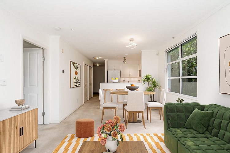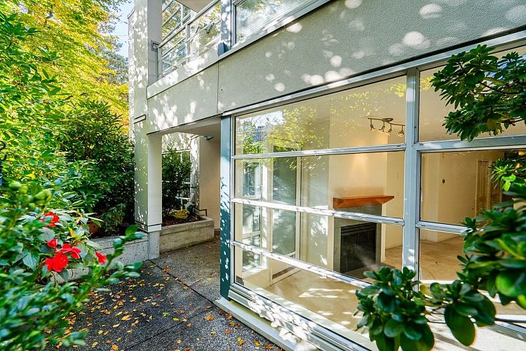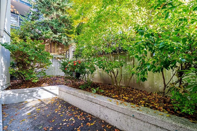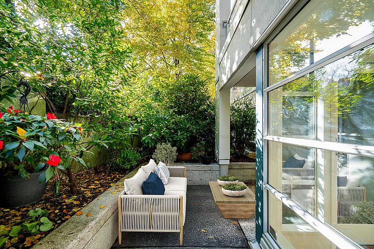This gorgeous, ground-level 2 bedroom, 2 bathroom south-facing corner home has been tastefully updated. Enjoy a fresh coat of paint, stylish kitchen & bathroom renovations. The kitchen features Silestone quartz countertops, sleek white cabinetry, premium appliances, & breakfast bar. The bright & open living/dining area is anchored by cozy gas fireplace & flows seamlessly onto your private sunny garden patio, surrounded by lush greenery and mature trees. The primary suite impresses with ensuite boasting a walk-in shower and ample closet space. Comfort is key with radiant in-floor heating throughout the home. Located in the heart of Kitsilano, just steps to transit, parks, boutique shops, cafés, groceries, & beach. Proactive strata, fully rainscreened building, & Furry friends are welcome!