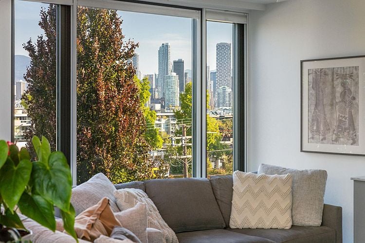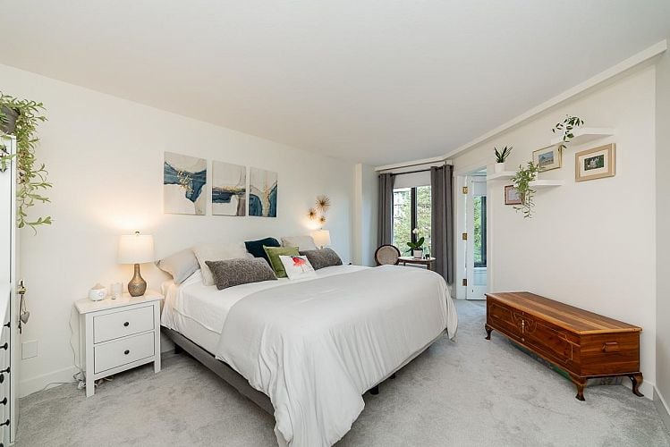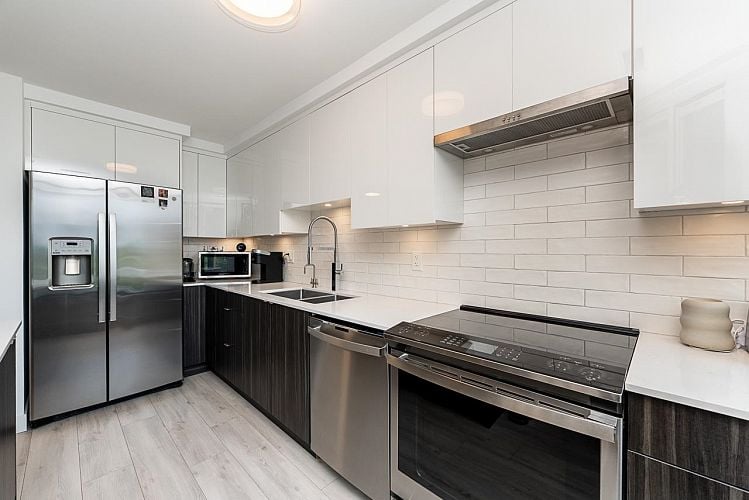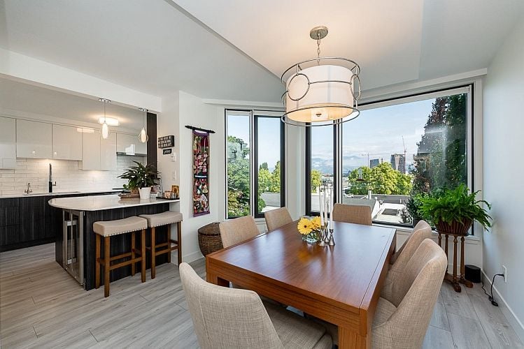 Experience unmatched quality in this fully rain-screened concrete condo with triple-glazed windows with sweeping NorthWest views of city & mountains. The custom kitchen features Silestone quartz counters, wine fridge, & GE Profile appliances. The open-concept layout includes reimagined dining area—easily convertible back to 3rd bedroom if desired—alongside Dimplex fireplace & custom millwork. Extensively renovated with over $14K in motorized blinds, fresh paint, upgraded carpets, baseboards, trim, LED lighting, & high-efficiency heaters. Luxurious touches include NuHeat heated floors, dimmable LED mirrors, & premium UK fixtures. Includes 2 side-by-side parking, storage, & access to saltwater pool, hot tub, & sauna. EV-ready building with proactive strata & $16M envelope renewal completed.