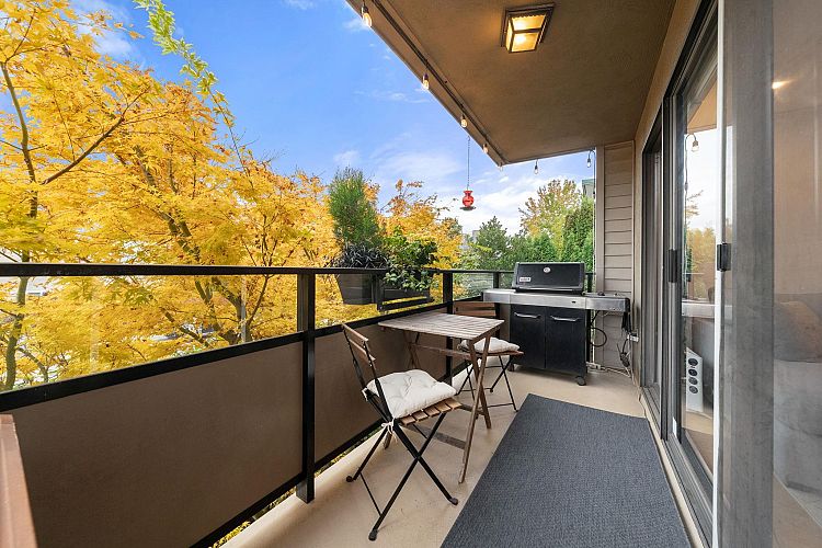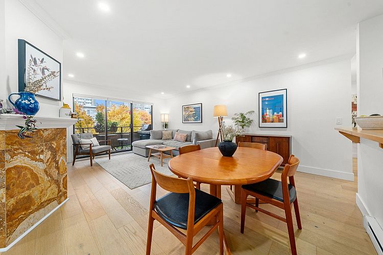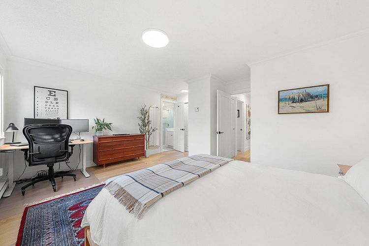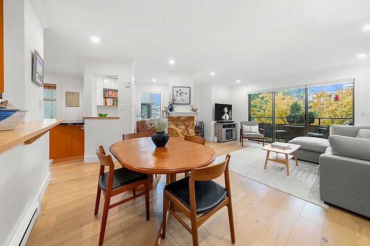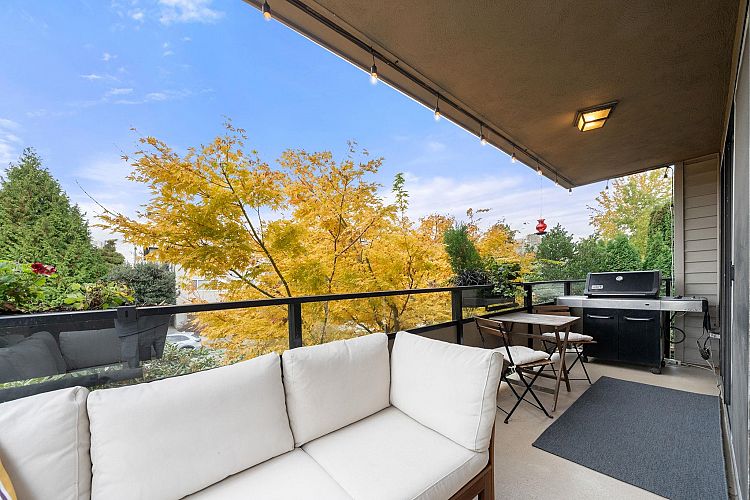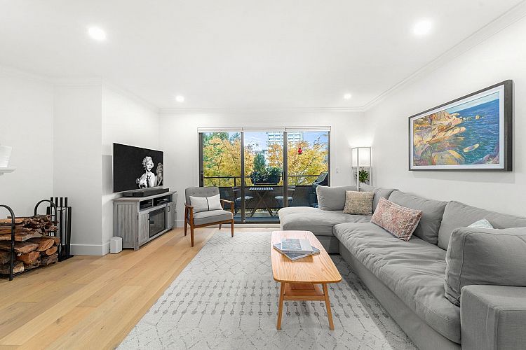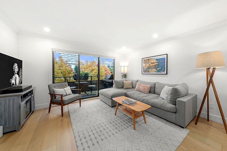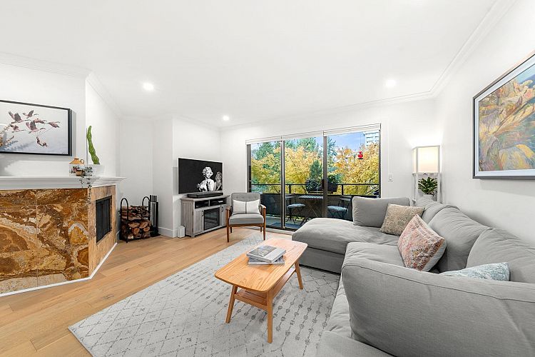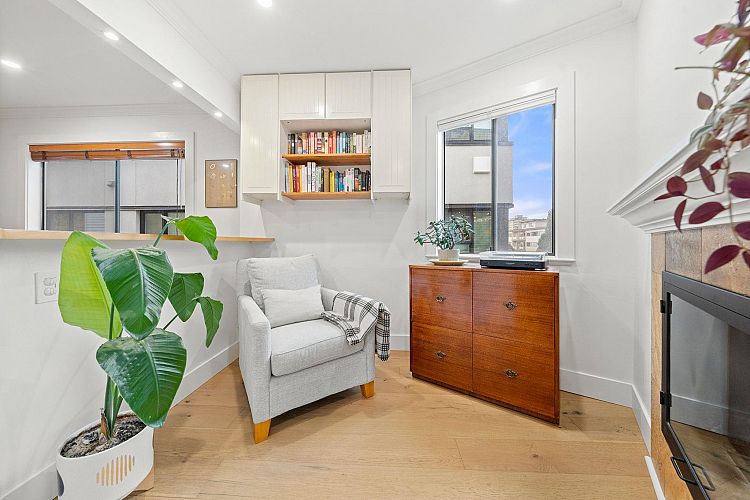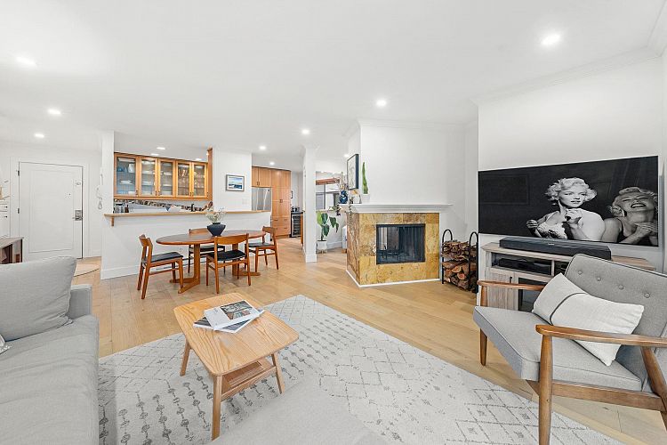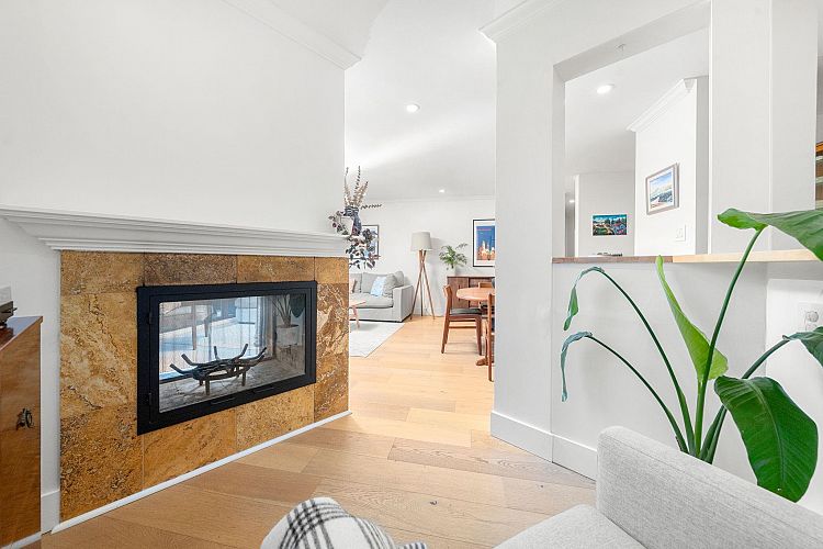 Boutique, 5 unit strata in a no fuss, easy maintenance building! Suite 201 occupies the entire front half of the floor, allowing for windows on 3 sides of the home. At nearly 1,200 sqft, there are zero compromises on space. The suite has been caringly updated & features wide plank Oak hardwood, updated lighting, blinds, paint & trim throughout. Enjoy open concept living & a large L shaped deck for summer evenings. Features include a dual-sided f/p, cozy den, & large updated kitchen with coffee bar area. The bedrooms are spacious, including a primary with dual closets & a full ensuite. Tons of in suite storage, plus 2 external lockers & 1 parking. Pets allowed & in suite laundry allowed w/ strata approval. Roof replaced 2025!