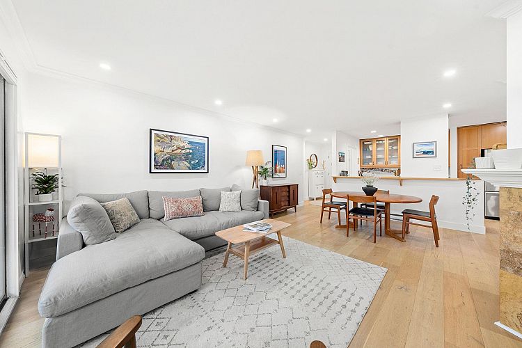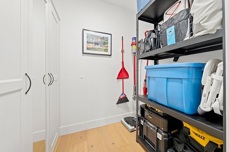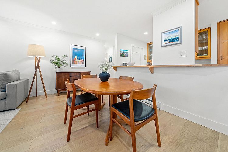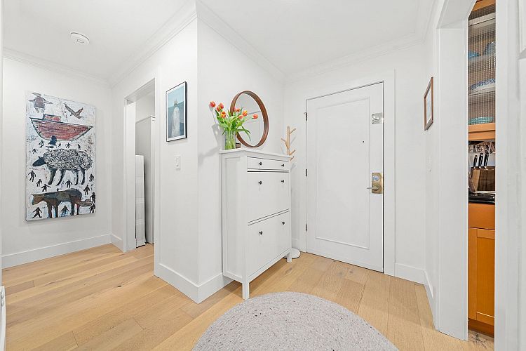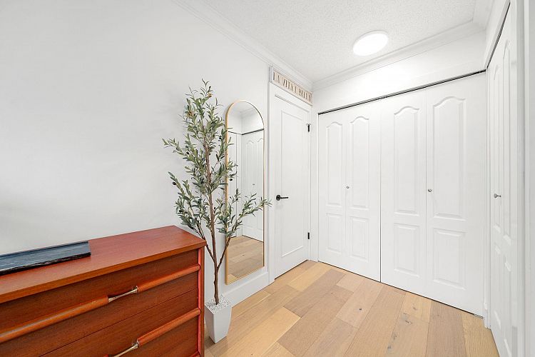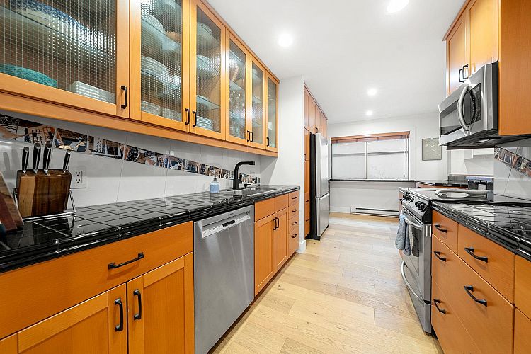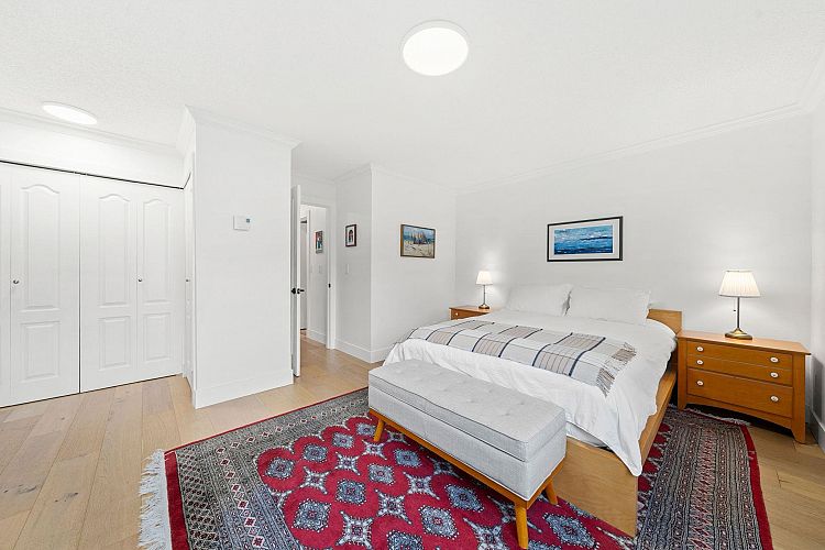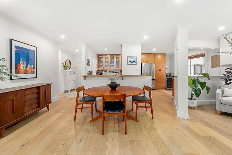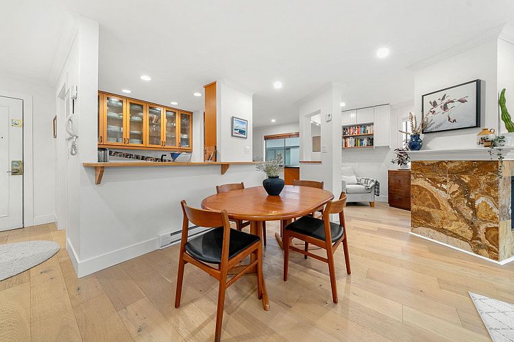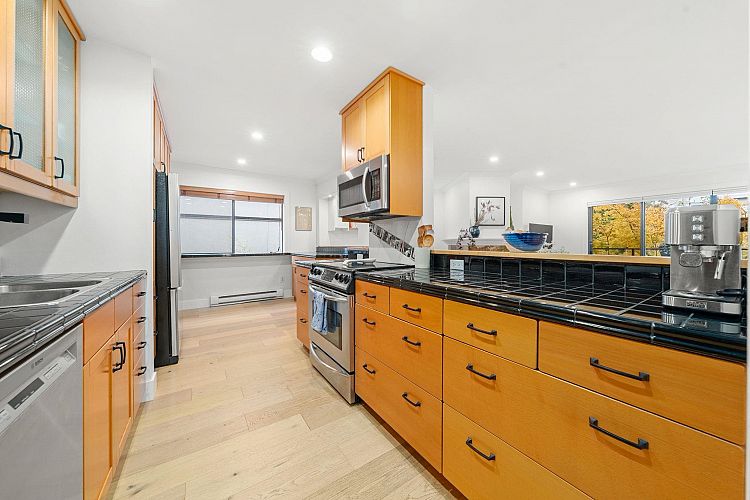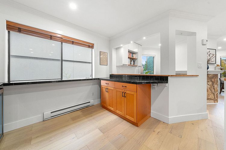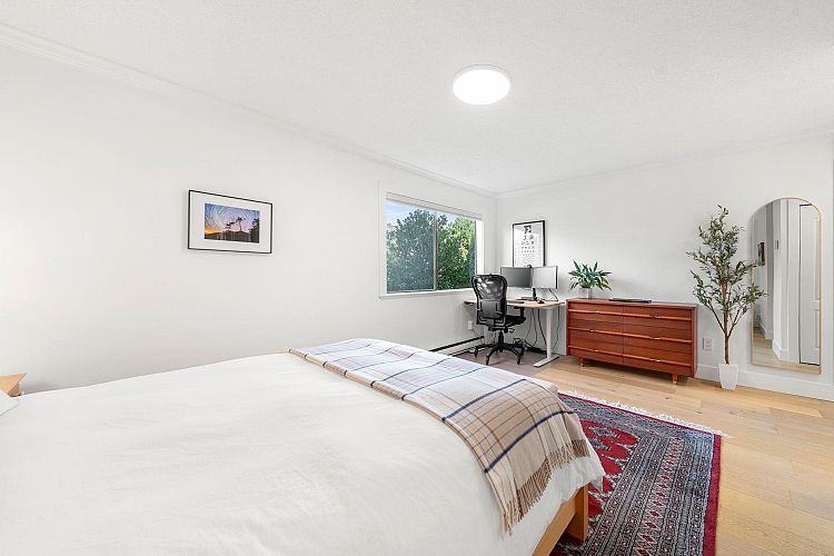 Boutique, 5 unit strata in a no fuss, easy maintenance building! Suite 201 occupies the entire front half of the floor, allowing for windows on 3 sides of the home. At nearly 1,200 sqft, there are zero compromises on space. The suite has been caringly updated & features wide plank Oak hardwood, updated lighting, blinds, paint & trim throughout. Enjoy open concept living & a large L shaped deck for summer evenings. Features include a dual-sided f/p, cozy den, & large updated kitchen with coffee bar area. The bedrooms are spacious, including a primary with dual closets & a full ensuite. Tons of in suite storage, plus 2 external lockers & 1 parking. Pets allowed & in suite laundry allowed w/ strata approval. Roof replaced 2025!