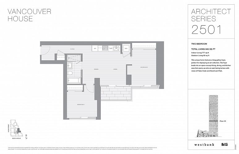 PRICED TO SELL! Best Price per square foot in the building. Vancouver House by world renowned starchitect Bjarke Ingles, developed by award winning Westbank corp. is an architectural marvel of our downtown skyline. 2501 is a 2 bedroom 1 bathroom with 777 SF of interior space and an additional 68 SF of outdoor space looking over False Creek, Yaletown and beyond. Interior finishing has Italian Boffi kitchen paired with Miele appliances, 4 piece bathroom with separate glass shower and tub with beautiful light oak hardwood flooring throughout. Extensive and luxurious amenities including 24 hours concierge service, 10,000 SF fitness center, an outdoor pool and more. contact us today to schedule a private showing.