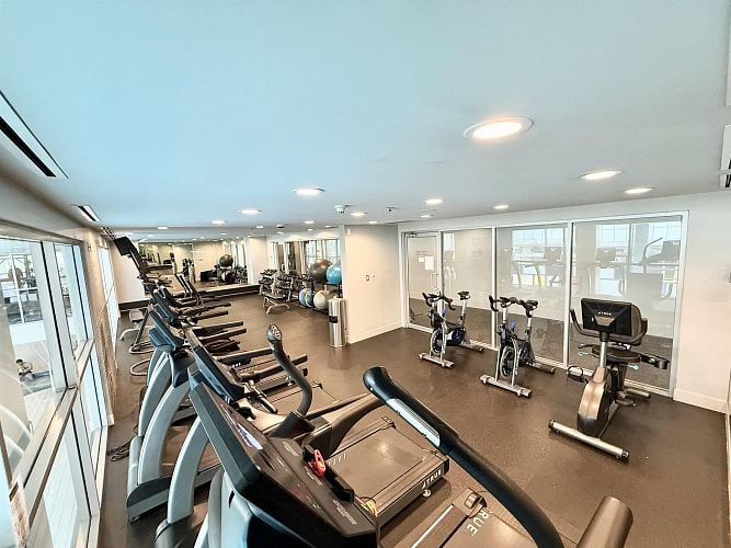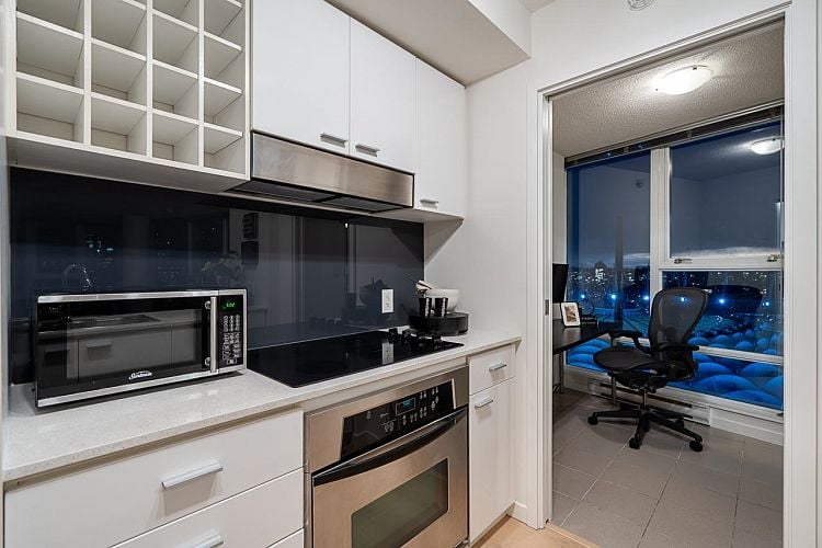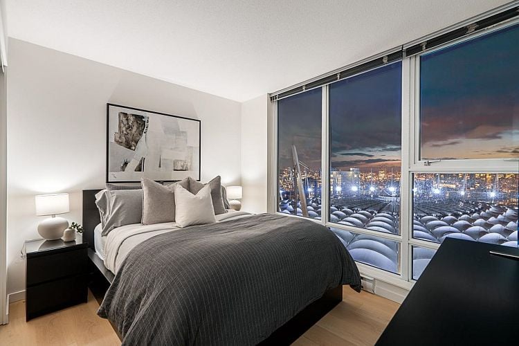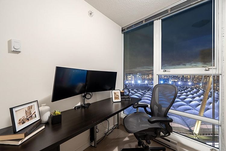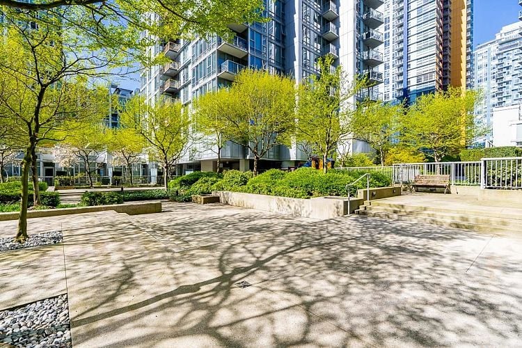 A New Year, a New Look! Welcome to this stunning SW-facing 2 bed, 2 bath & den home at Spectrum 1, refreshed with wide-plank flooring and beautiful paint tone. This 893 sq.ft residence features floor-to-ceiling windows with expansive city views from all main living areas. The well-designed layout separates the primary bedroom with ensuite from the second bedroom for added privacy. An open-concept kitchen, living, and dining area is ideal for entertaining. Highlights include a generous in-suite storage/flex space and solarium perfect for a home office, a BBQ-friendly patio, & parking stall. Enjoy resort-style amenities including a pool, fitness centre, party room, outdoor terrace, bike room, and 24-hour concierge. Steps to dining, transit, Costco, the seawall, downtown entertainment!