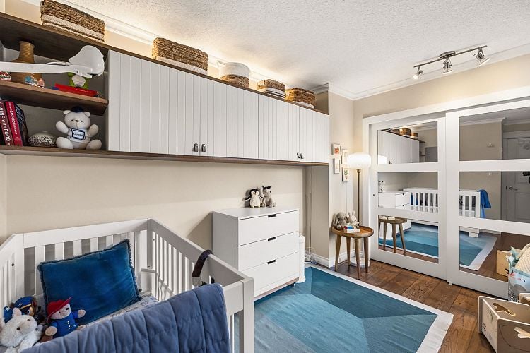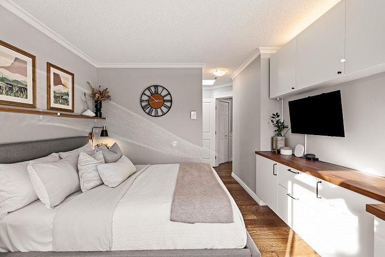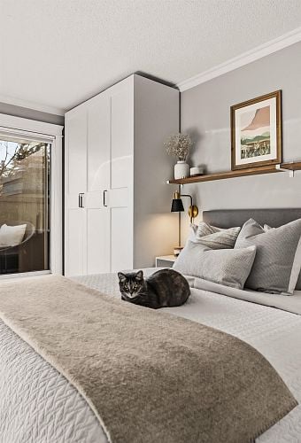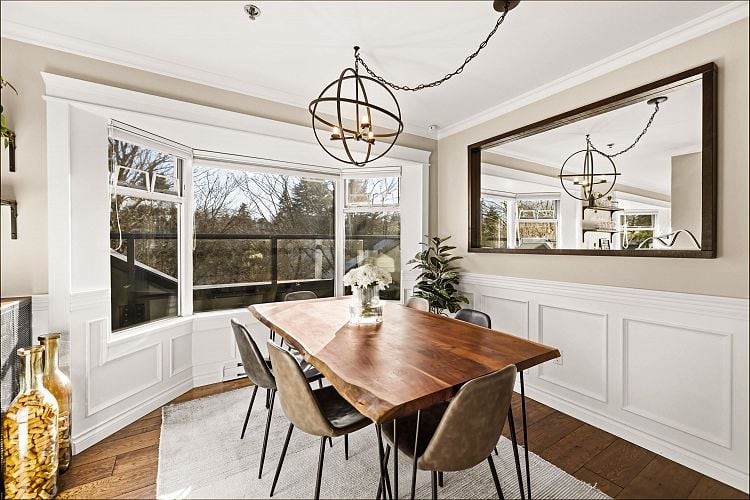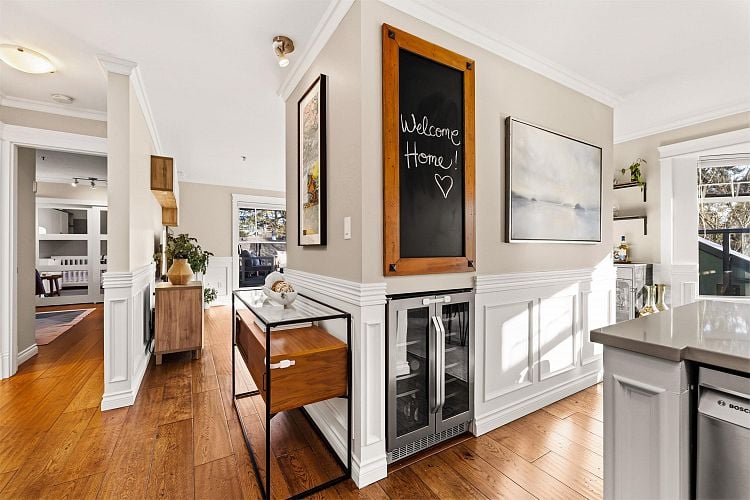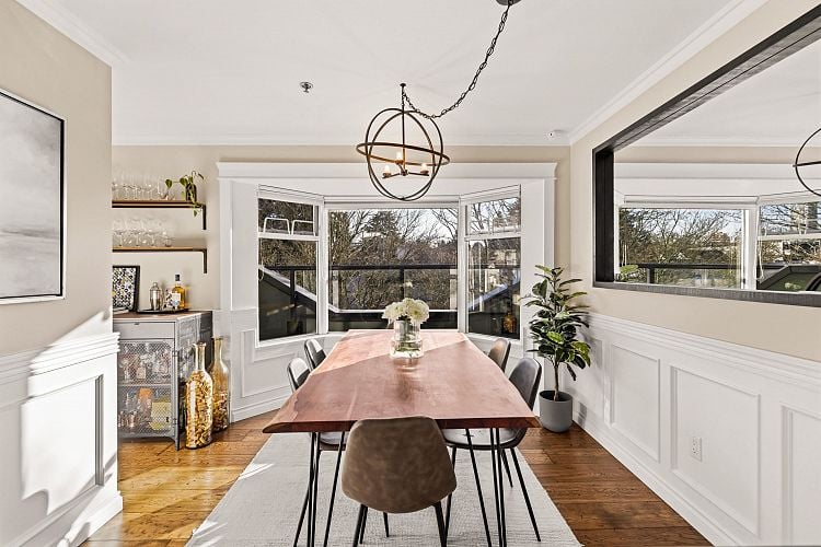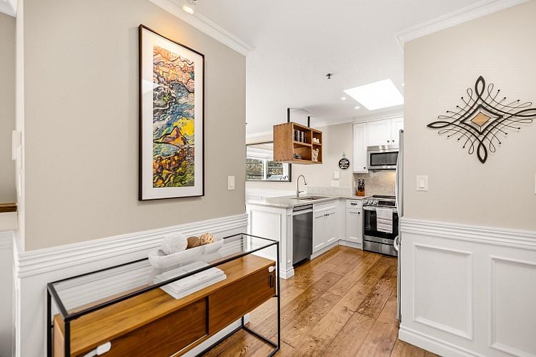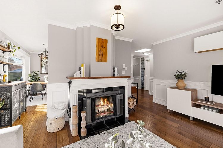 Welcome to this stunning penthouse in Kitsilano. This south facing 2bed+2bath 1,129 sqft home sprawls across the entire length of the top floor w NO shared walls. The expansive private patio extends your living space outdoor, ideal for quiet summer evenings. Bask in 3 sunny exposures & natural light from multiple skylights. Features include: spacious living room w cozy wood burning fireplace, engineered hardwood, charming wainscoting & crown moldings, custom built in’s, stainless steel appliances, wine fridge & granite countertops. Thoughtful layout w bedrooms on opposite sides of the home. The dreamy primary suite offers a spectacular ensuite w bay window, heated floors, glass rain shower & luxe free-standing bathtub. Rain-screened building w 2 parking w EV. Pets welcome. A TRUE GEM!