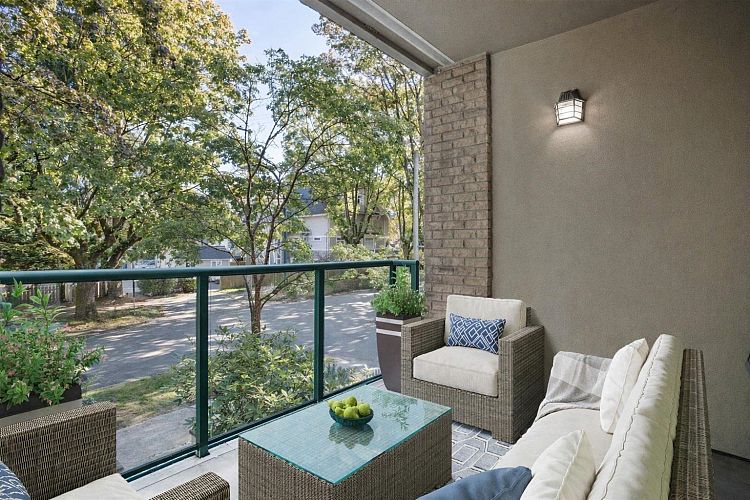 Welcome to The Maples. Concrete, spacious two-bedroom w/ two full baths & a den w/ custom shelving. Quiet, east exposure w/ the living area overlooking tree-lined Maple Street. Fully Renovated. Beautiful Lauzon walnut hardwood flooring throughout the main living areas, a large covered balcony/deck, high 9 ft. ceilings, and an appealing bay window with seating in the living area. Excellent floor plan with an open kitchen, Bosch & LG stainless steel appliances. 2 AC units incl w/ custom plexiglass. Fresh paint. Desirable school catchment includes Kitsilano Secondary & Henry Hudson Elementary. 95 Walk Score, 95 Bike Score. Steps to Arbutus Greenway & minutes to beaches. 8-min drive to DT Vancouver & walking distance to the new millennium line extension (2027). Book a private showing today!