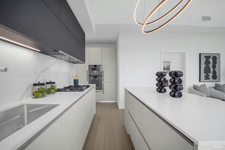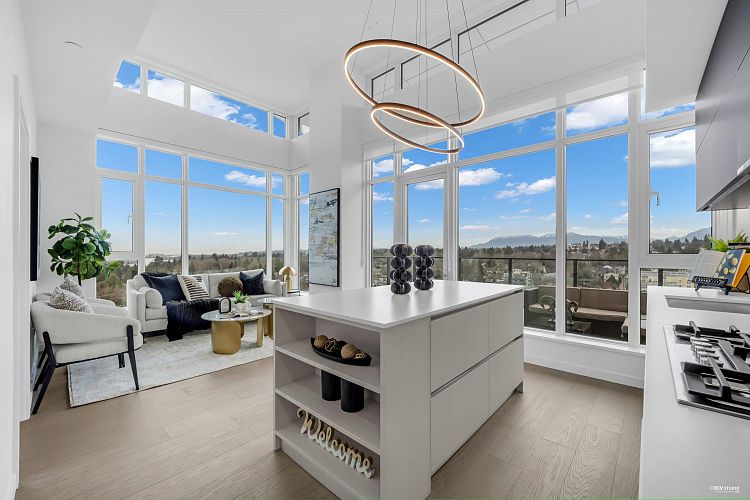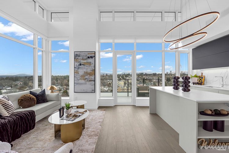 Occupying a prime corner position at the top of the building, this exceptional Penthouse 3 Bed + Den residence captures sweeping views toward distant mountains and water, offering a rare unobstructed outlook with views from every window. A dramatic 14-foot ceiling height enhances the sense of scale, while expansive windows draw in natural light and reinforce the home’s open, airy atmosphere. Principal living spaces are oriented to embrace surrounding scenery, maintaining a strong visual connection to the landscape. The kitchen features a full Gaggenau appliance package, reflecting the premium standard of this top-floor home. Located within W68 by Westland Living at Granville & W 68th. A rare top-floor offering defined by light, scale, and views.
