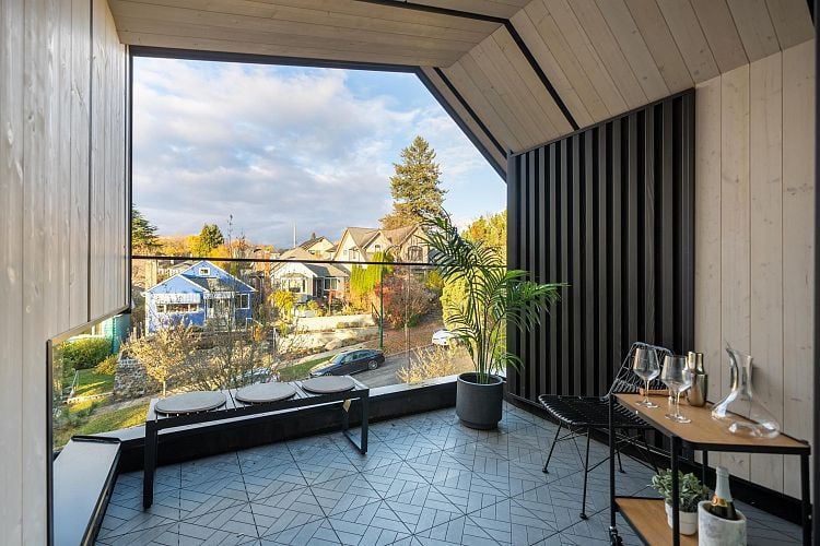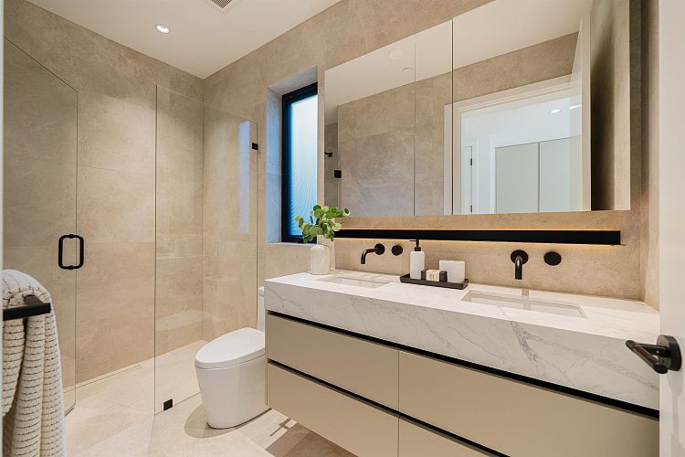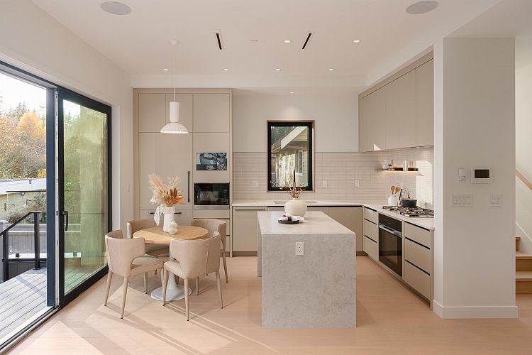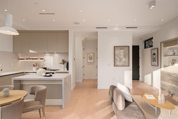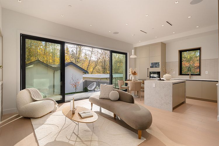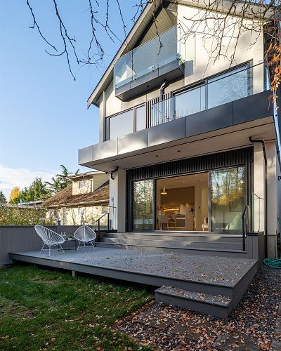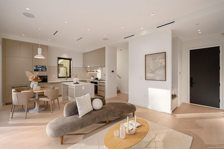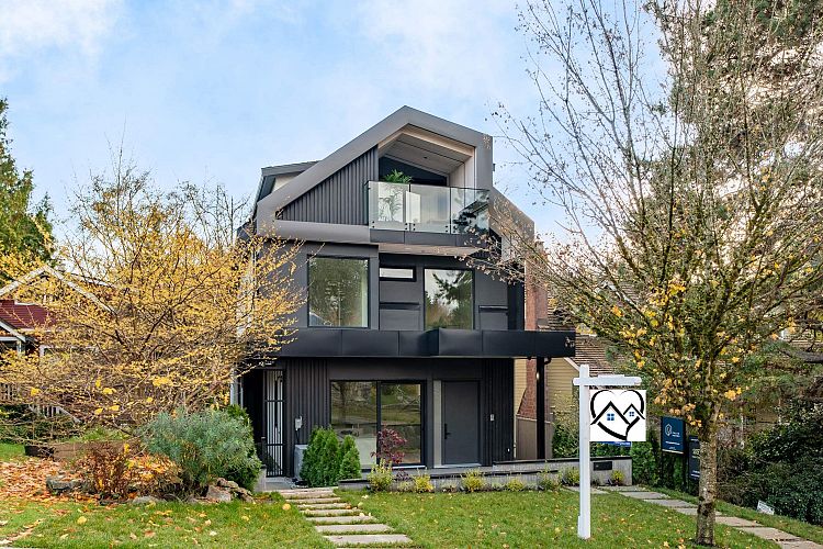 Discover modern luxury in this stunning brand-new half duplex by Georgie Award finalist Palas Homes, set on a picturesque tree-lined street in prestigious West Dunbar. Spanning 1,612 SF, this home offers 3 bedrooms, 3.5 baths, open layout with high ceilings, oak floors, and oversized Euroline windows. Gourmet kitchen features custom cabinetry, quartz counters, integrated Miele appliances — perfect for entertaining. Upper level has two spacious bedrooms with ensuites, while the top-floor retreat boasts vaulted ceilings and a private balcony overlooking Pacific Spirit Park behind the home. Enjoy a sunny south-facing patio, A/C, radiant heat, EV-ready garage, and 2-5-10 warranty. Steps to Vancouver’s best schools, this home perfectly blends elegance, quality, and nature at your door step.