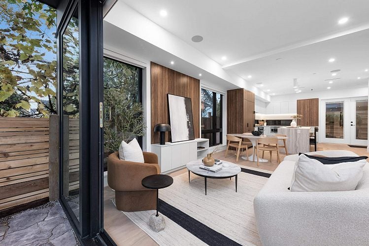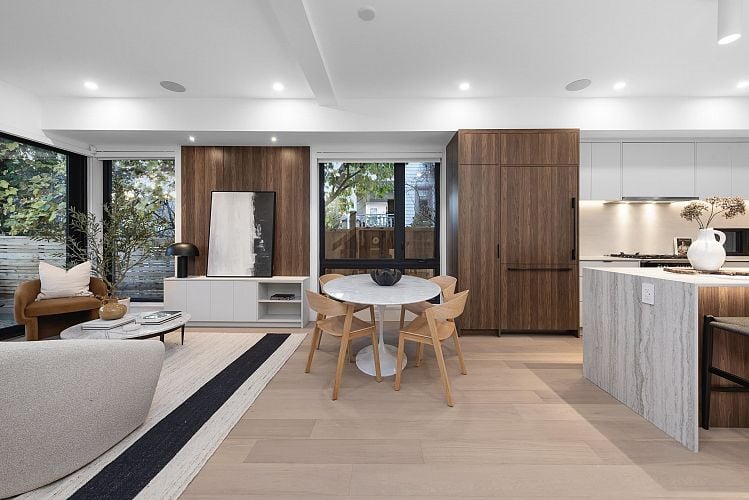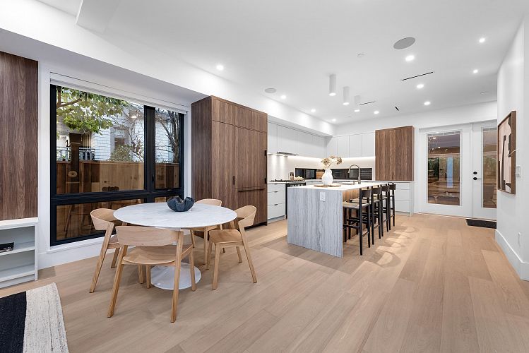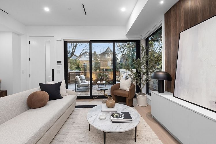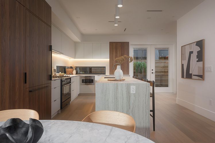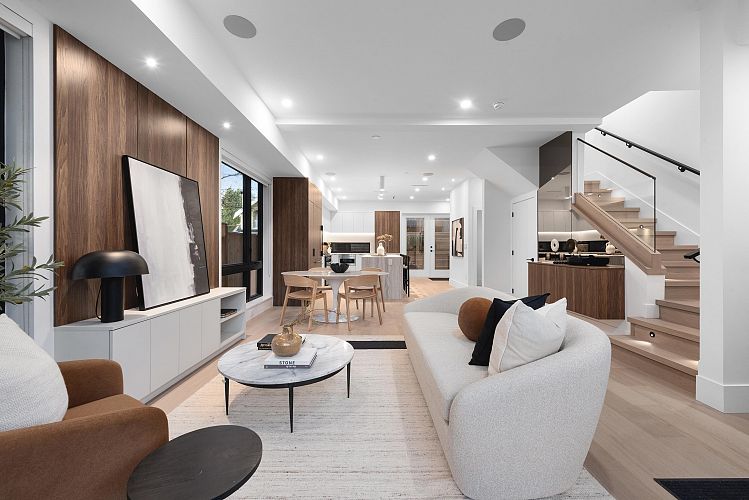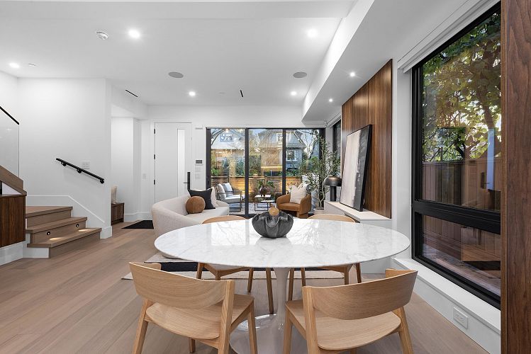 Crafted by Vandwell Developments, this brand-new 4 bed, 4.5 bath 1,969sqft side-by-side half duplex in coveted Cambie Village pairs refined design with effortless indoor–outdoor living. A panoramic private rooftop deck captures sweeping mountain, skyline views and sunsets. Floor-to-ceiling windows flood the main level with light and open to 2 secured patios, perfect for entertaining. Inside, seamless glass railings, built-in sound and a sleek chef’s kitchen create a calm modern backdrop. Upper bdrms enjoy treed and city outlooks, while a heated crawl space offers exceptional storage. All on a quiet, tree-lined street steps to shops, parks, restaurants, Canada Line, plus top public and private schools.