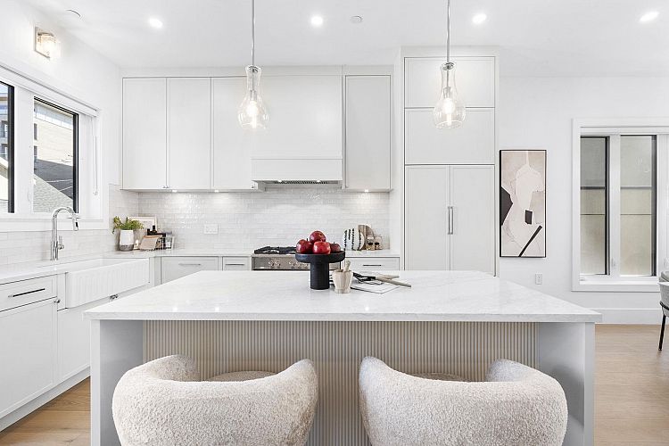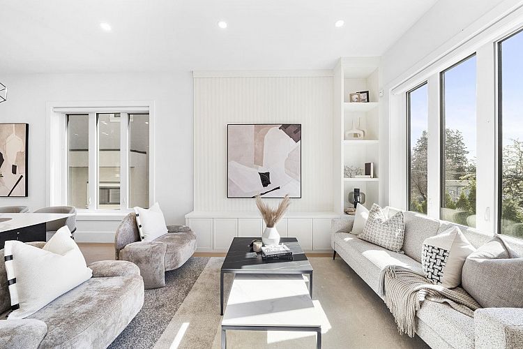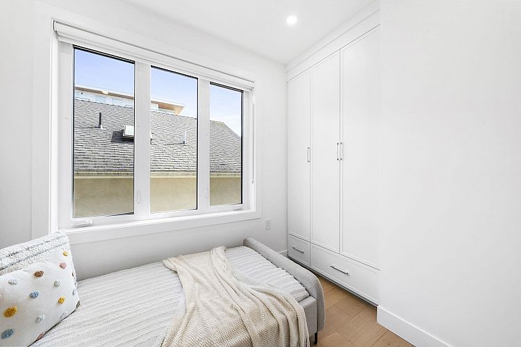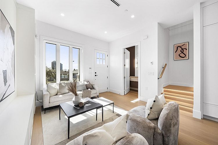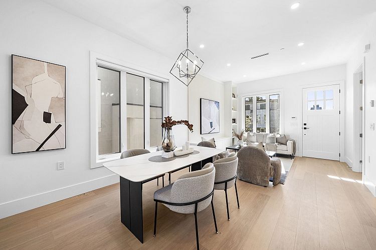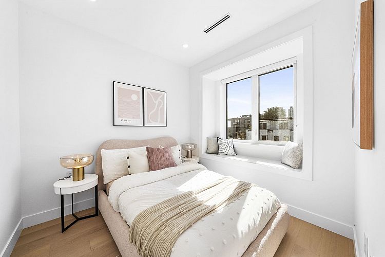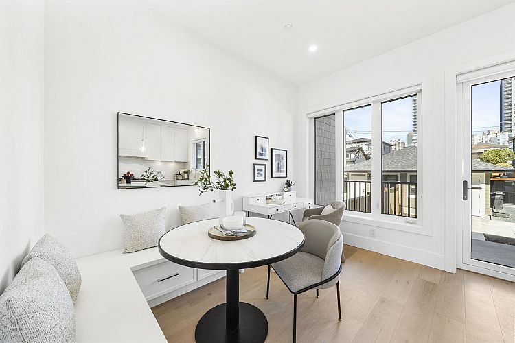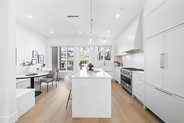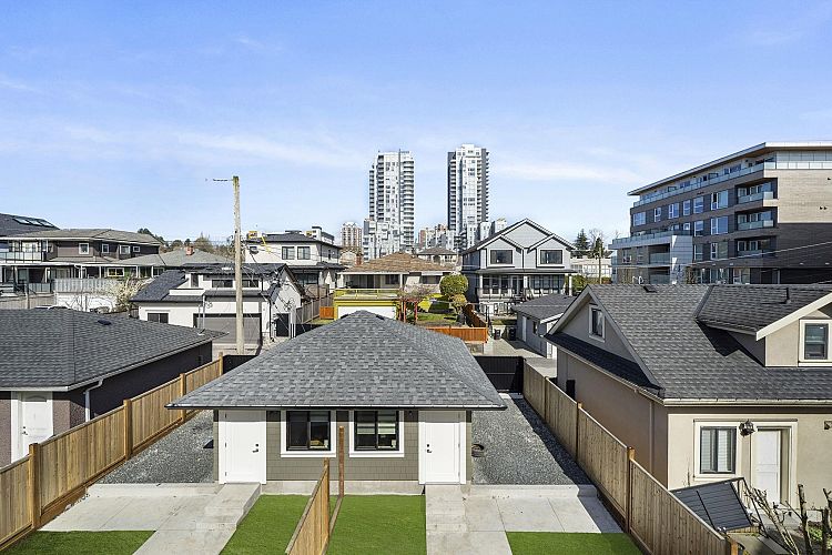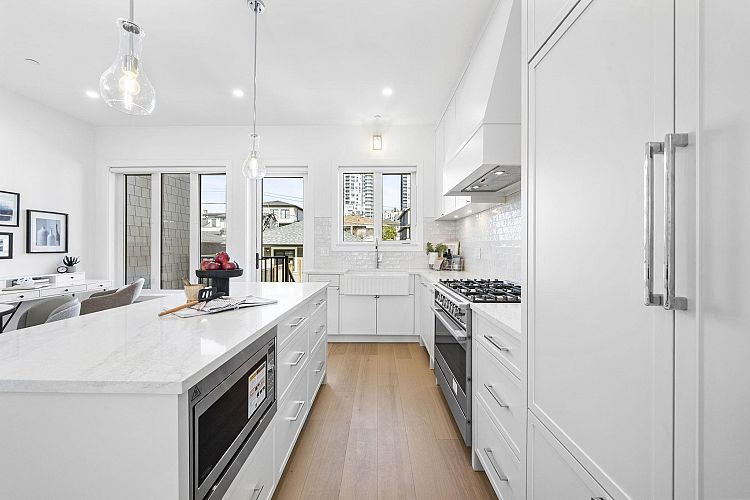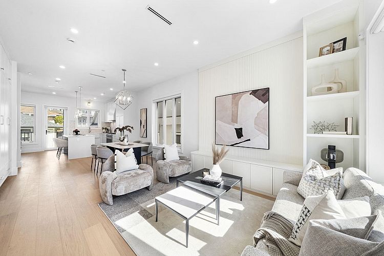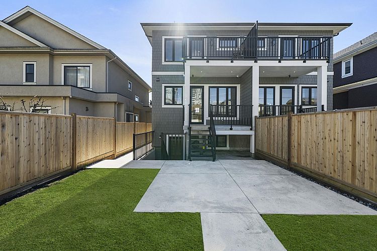 Welcome HOME to this QUALITY built craftsman-style SIDE x SIDE duplex 46ft wide lot, amazing CAMBIE location, just an 8min walk from Marine Gateway skytrain! This BRIGHT, SUNNY, efficient 4bd 3.5bth home incl DIRECT interior access to 1bd 1bth suite w/separate entrance – you can AIRBNB THIS SUITE! Feel the LUXURY the moment you enter this home w/ EXQUISITE millwork, engineered hardwood floors, radiant heat, A/C, 10ft HIGH CEILINGS & DESIGNER powder room! You will LOVE spending time w/family in the CHEFS KITCHEN W/ HUGE island, Fisher Paykel Appliances, GAS stove, gorgeous textured backsplash, & BUILT-IN BREAKFAST NOOK overlooking the backyard! Upstairs is the ELEGANTLY ensuited KING-SIZED Primary bdrm w/deck, QUEEN-SIZED 2nd bdrm, the perfect 3rd bdrm & beautifully appointed full bath!