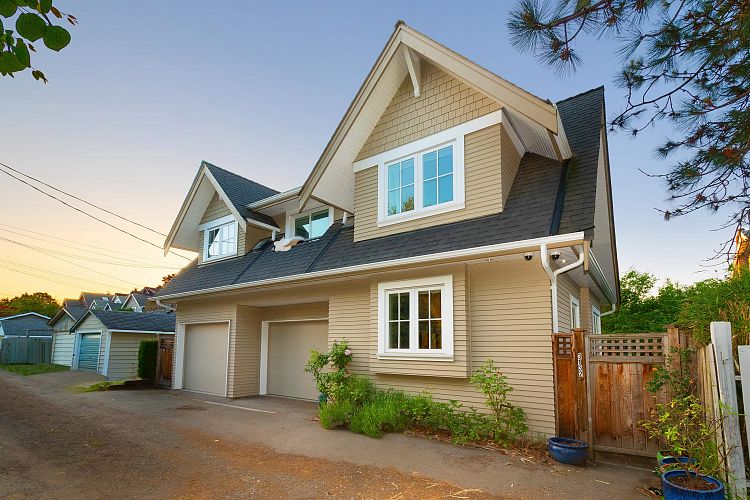 Rarely Available COACH HOUSE in Prime Kitsilano! This private and quiet coach house offers the charm of a detached home without the price tag. The main floor features an open-concept kitchen, living, and dining area, while upstairs boasts two bedrooms, two bathrooms, and a flexible family room/office. Enjoy the convenience of an attached single-car garage, perfect as a gym, office, or storage. Step outside to your private yard with two garden beds—a peaceful retreat. Built in 2014 with durable Hardie board siding, this home offers modern construction and peace of mind. Prime location just a short stroll to the vibrant shops, cafés, and restaurants of West Broadway, and minutes from the beach.
