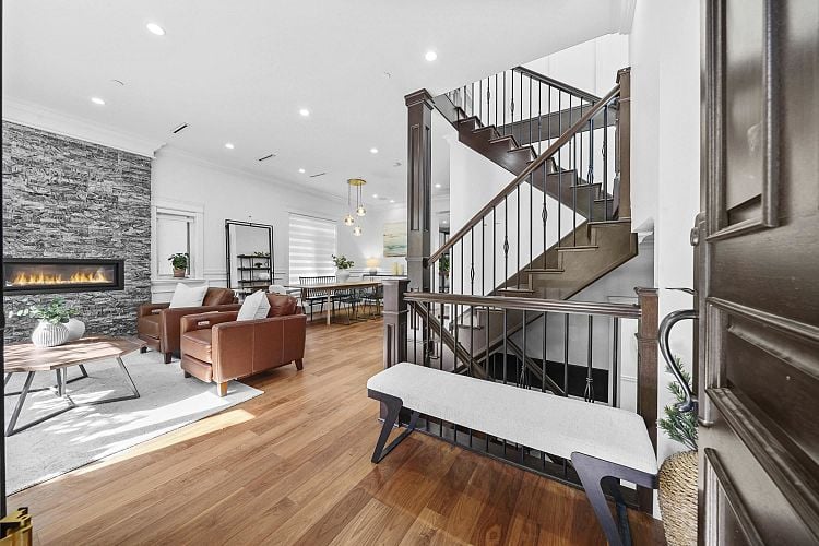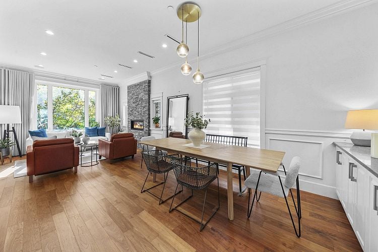 Stunning Modern Home in Prestigious Dunbar. This beautifully designed residence blends contemporary elegance with everyday functionality. Featuring premium Gaggenau appliances and complemented by a fully equipped wok kitchen for culinary versatility. Engineered hardwood floors throughout, floor-to-ceiling windows, skylights, 9' and 10’ ceilings and South-facing with abundant natural light. Built-in ceiling stereo and security cameras. 4 bed and 4.5 bath, Rec room, One-bed basement suite, porch, and a sunlit deck, this property provides both comfort and flexibility for modern living. EV ready. Nestled on a quiet street, yet just steps from vibrant Dunbar Street’s daily convenience and lifestyle. Private showings only.