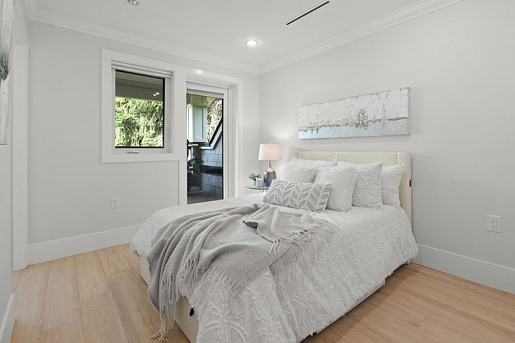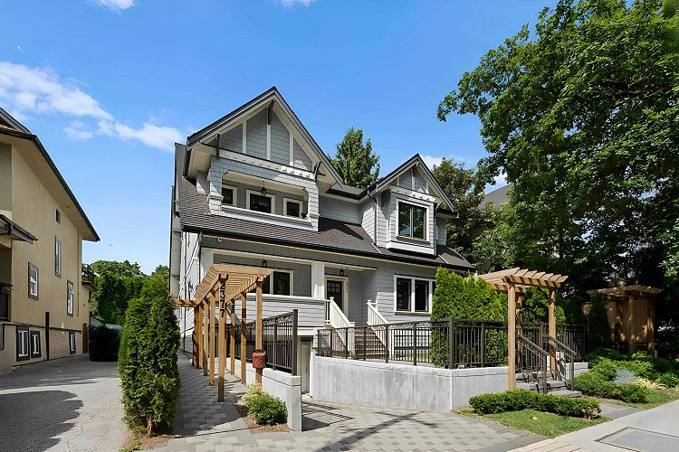 GST INCLUDED. This boutique strata triplex back unit is ideally located within 800m of the future Arbutus SkyTrain Station. Completed in 2024 and lightly lived in, it offers 2 bedrooms plus a large flex and 4 full bathrooms. With its own window and bath, the flex works perfectly as a guest suite, home office, or optional third bedroom. Both primary bedrooms open onto a sunny balcony overlooking a 900 sq ft private backyard, creating a rare indoor outdoor living experience for coffee mornings and evening dining. The chef inspired kitchen features quartz countertops, custom cabinetry, Fisher and Paykel and LG appliances, and a wine fridge. Radiant heating, air conditioning, and HRV. EV ready parking, storage, and bike locker included. Property cheat sheet available.