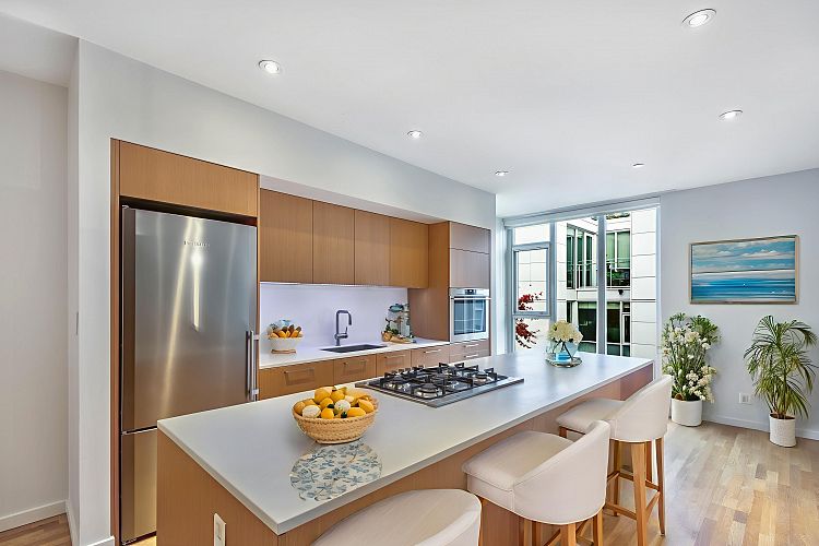 Sixth + Steel, a luxury modern townhouse development designed by renowned architect MGA in the heart of Fairview Slopes. This quiet & secure inner courtyard home offers an efficient floor plan with over 1400sqft of living space, radiant hardwood flooring throughout, large principle rooms, a sleek European designed kitchen with quality appliance and ample storage options. Upstairs, you'll find a spacious private rooftop deck, perfect for entertaining with natural gas and water line. Additional amenities include side-by-side parking with EV charging and a storage locker. Maintenance fees cover heat, hot water, and natural gas. Pets and rentals are permitted in accordance with strata bylaws. Photos are digitally staged. Open House: March 7th & 8th, 2pm-4pm.