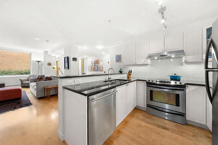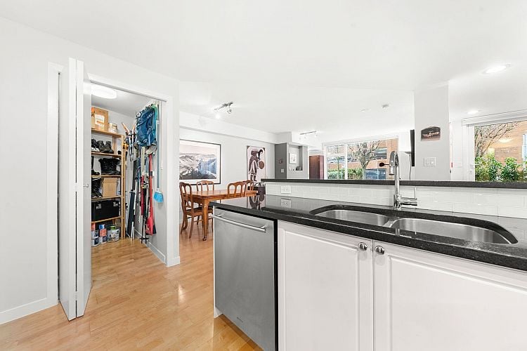 Rare as hen’s teeth in the heart of Kits! This ground-level, private entry 950sf 1 bed & 2 bath TH delivers big – the dining space, open kitchen, comfy living room, office space and generous in-suite storage serves the first timer, the down-sizer, or the long-termer equally well. Hunter Douglas blinds, roller screens on every door, direct access to outdoors (pet owners rejoice!), fine finishings and a cozy fireplace deliver the whole package. Yorkville's building envelope has been completely re-done in the past five years – roof, siding, windows and $600k in CRF! The 97 walk score offers health, wellness, daily needs and your pick of food & drink — Oddfish and AnnaLena are steps away. The beach is 2 blcks west and bike paths abound. Two cats or one dog up to 50 lbs. OPEN MARCH 1, 2-4PM.