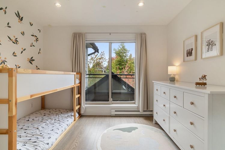 Tucked away on a quiet tree lined street between Oak & Cambie this renovated 2-bed, 2-bath corner townhome offers over 1200sqft of thoughtfully designed living space drenched in natural light. The open concept main level is perfect for both relaxed living & effortless entertaining, featuring a modern kitchen with s/s appliances & granite countertops, flowing into a spacious living area anchored by a striking tiled fireplace. Upstairs 2 generous bedrooms are complemented by 2 full baths, including a spa-inspired ensuite w/steam shower, along with a large laundry room offering additional storage. Enjoy the flexibility of direct street access or the convenience of elevator entry from the parkade. The balance of urban convenience & calm residential living. 2 parking & oversized storage locker