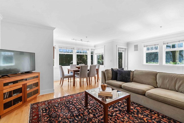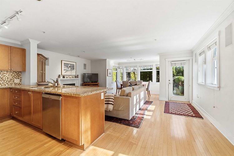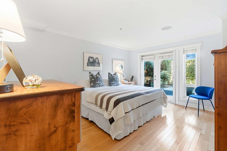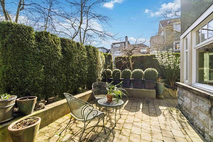 Welcome to Sasamat Gardens! This spacious 1-level 1554 sq ft townhouse offers 2 bedrooms, 2.5 baths, a versatile den/office (or 3rd bdrm)+ a private 200 sq ft patio & garden, perfect for relaxing or entertaining. Enjoy easy access thru your own private front entrance or stair-free access via elevator. An open concept floor plan with gleaming HW floors, radiant heat, abundant natural light, generous living & dining area to accommodate house-sized furniture+ an open kitchen ideal for everyday living & hosting. 2 parking stalls, can add EV charger, + oversize storage room located in Sasamat Gardens, a beautifully maintained complex in a lovely treed area of Pt Grey close to the beach & charming shops, cafes & restaurants on West 10th Avenue.