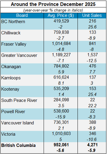 Vancouver, BC – January 13, 2026. The British Columbia Real Estate Association (BCREA) reports that 4,271 residential unit sales were recorded in Multiple Listing Service® (MLS®) Systems in December 2025, down 5.9 per cent from December 2024. The average MLS® residential price in BC in December 2025 was down 5.6 per cent at $952,061 compared to $1,008,513 in December 2024.