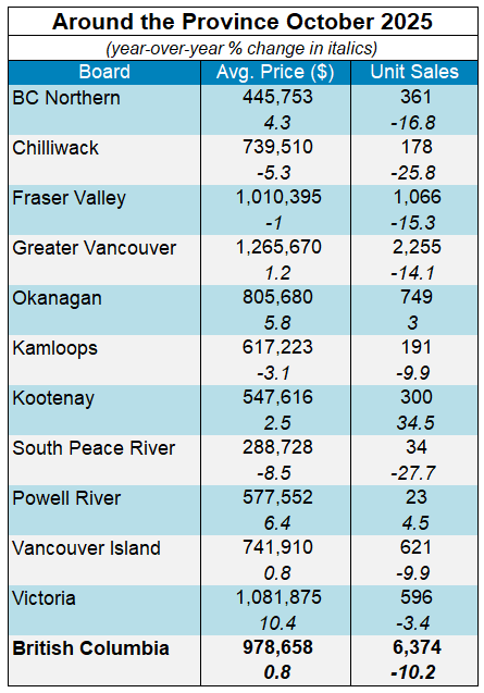 Vancouver, BC – November 12, 2025. The British Columbia Real Estate Association (BCREA) reports that 6,374 residential unit sales were recorded in Multiple Listing Service® (MLS®) Systems in October 2025, down 10.2 per cent from October 2024. The average MLS® residential price in BC in October 2025 was up 0.8 per cent at $978,658 compared to $970,483 in October 2024.